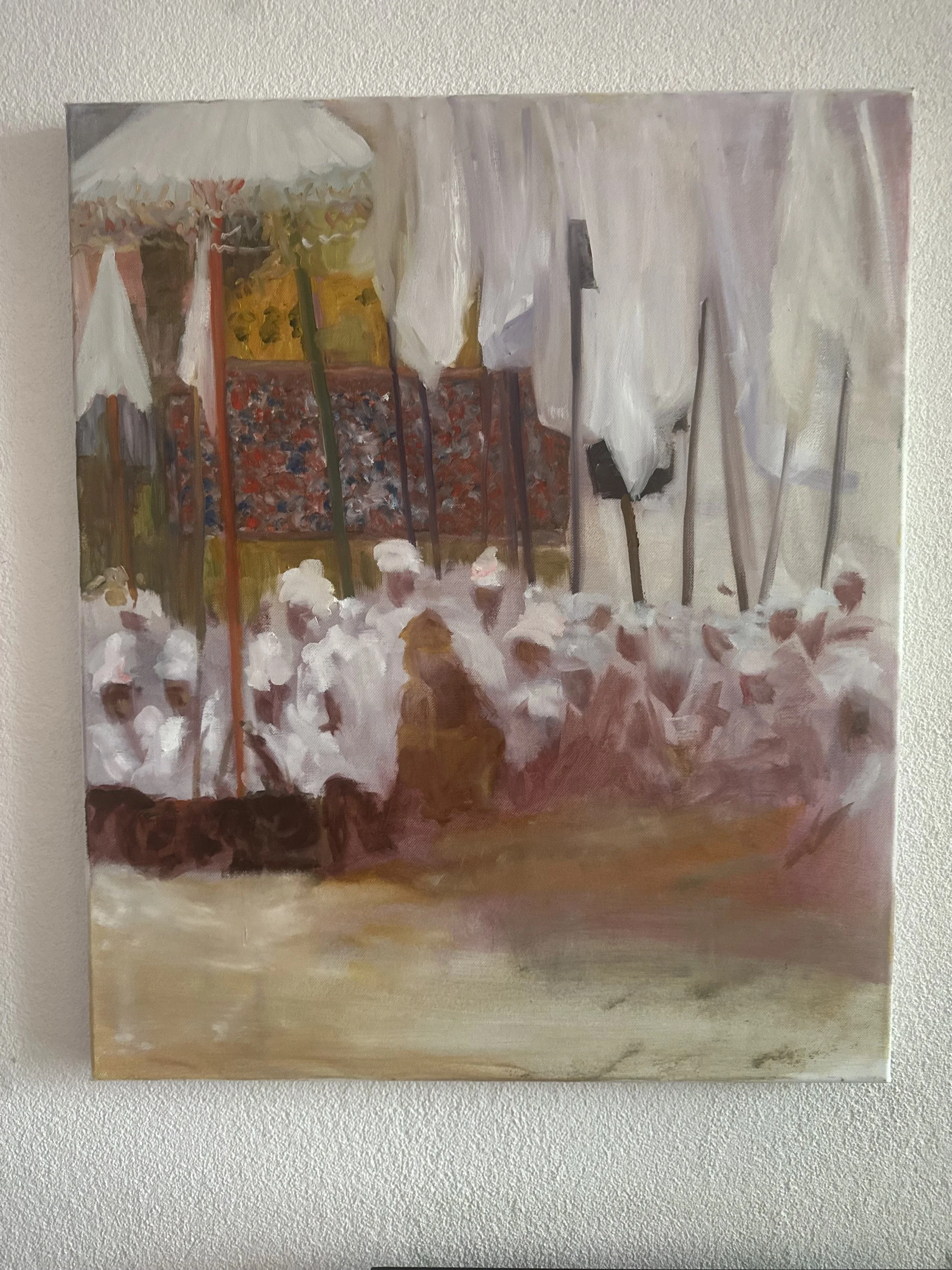 Bali, ceremonie waiting. A painting of three women wearing floral crowns, each dressed in colorful clothing—pink, green, and yellow. The women have dark hair and appear to be in a contemplative mood.